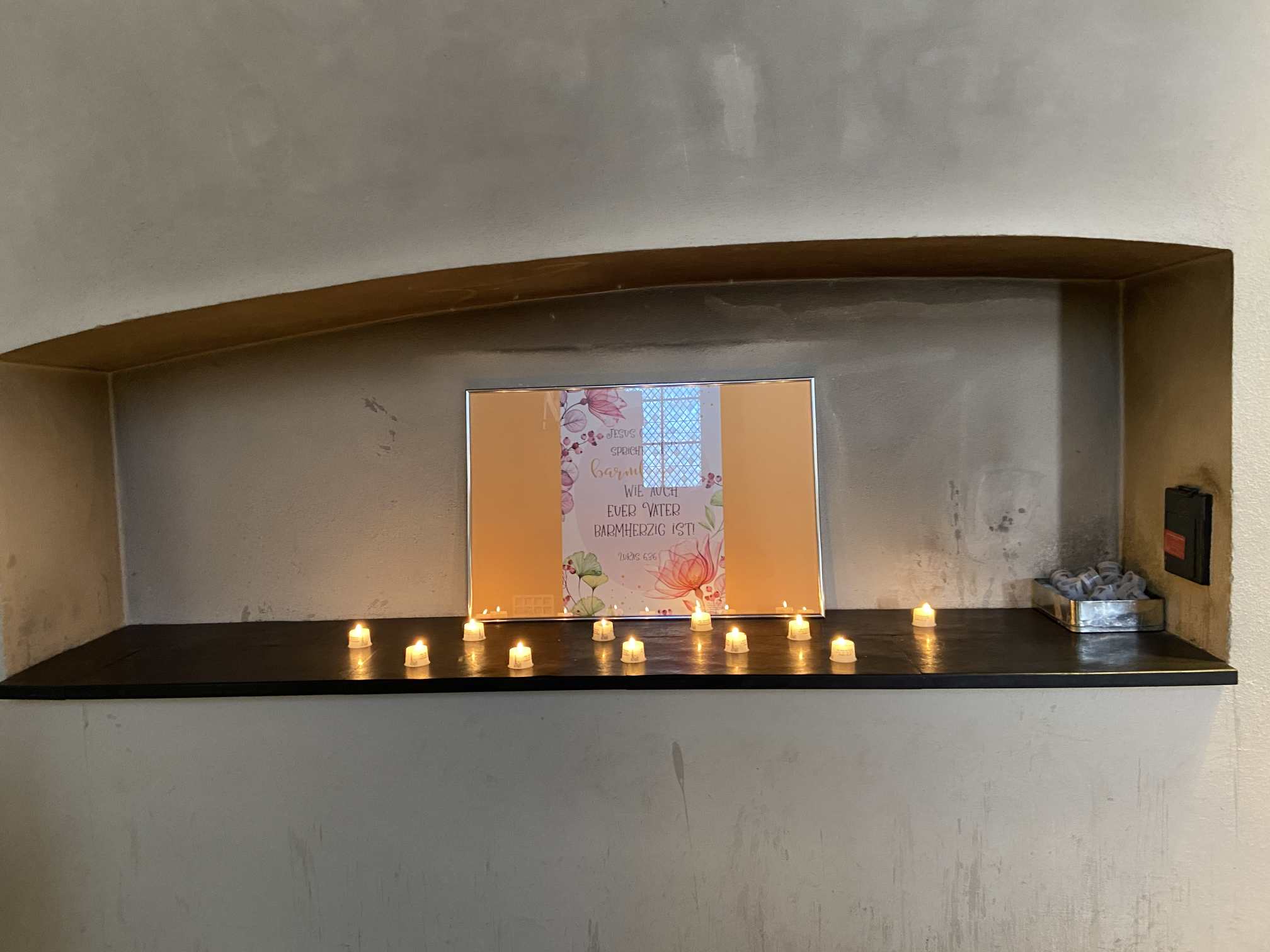 Eine breite Nische in der Westwand wurde während der Renovierungsarbeiten freigelegt. Die Gemeinde nutzt sie für ihre Wandzeitung, um aktuelle Themen aus evangelischer Sicht aufzugreifen.